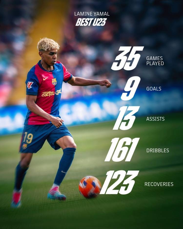 巴萨社媒晒出亚马尔本赛季西甲个人数据海报,并配文:当下与未来的璀璨巨星?